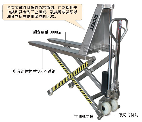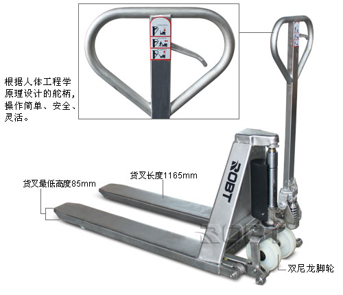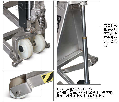 • 所有零部件材质都为不锈钢,包括液压泵,货叉框架,手柄,推杆,轴承,销和螺栓,等等。 • 广泛适用于肉类和其食品工业领域,乳类罐装类领域和其它所有使用腐酸的区域。 • 根据人体工程学原理设计的舵柄,操作简单、安全、灵活 • 高强度的车身,满足各种需求,适应性强 • 先进的液压系统具有轻载快速提升功能、效率高