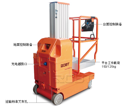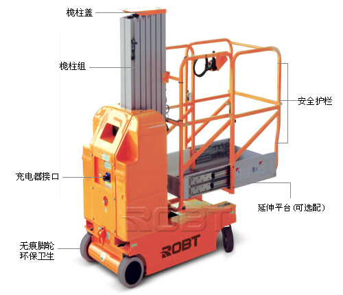 • 单向延升平台可以迅速铺开至作业点; 标准配置 • 超重传感器 • 连接到平台的AC电源 • 平台工作灯 • 连接到平台的导气管 • 延伸平台 • 建议室内使用 • ROBT为保障您的作业安全,高空平台类产品,每台免费附送一套安全帽和安全带。