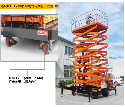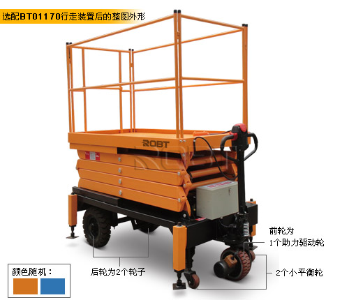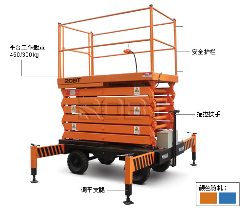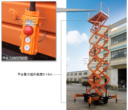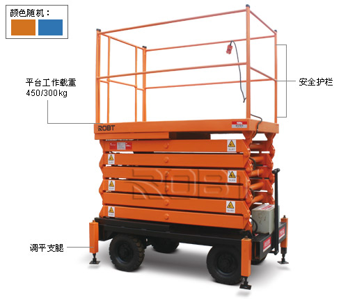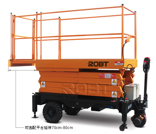 • 优质配置,Can总线智能装置 • ROBT为保障您的作业安全,高空平台类产品,每台免费附送一套安全帽和安全带。 (注:因机器本身自重较重,人力推行相对费力,厂家建议增加行走装置,减轻劳动强度)剪叉式升降机是用途广泛的高空作业专用设备。它的剪叉式机械结构,使升降台起升后有较高的稳定性,宽大的作业平台和较高的承载能力,使高空作业范围更大,并适合多人同时作业。它使高空作业效率更高,更安全。是用途广泛的高空作业升降设备。 特点:举升机构采用高强度锰钢钜形管制作。设有防止升降机超载的安全保护装置。设有防止液压管路破裂的安全保护阀。设有停电情况下的应急下降装置。该产品适用于各行业高空设备安装、检修等可移动性高空作业。根据不同要求可选择不同动力形式(如:三相交流电源、直流电源),加配上手动液压装置,可在停电或无电源场所照常升降工作,并可加伸缩平台,在平台长度不足时可延伸至所需位置,从而提高工作效率。是现代高大建筑、设备之理想配备产品,是高空安全文明生产之必备。