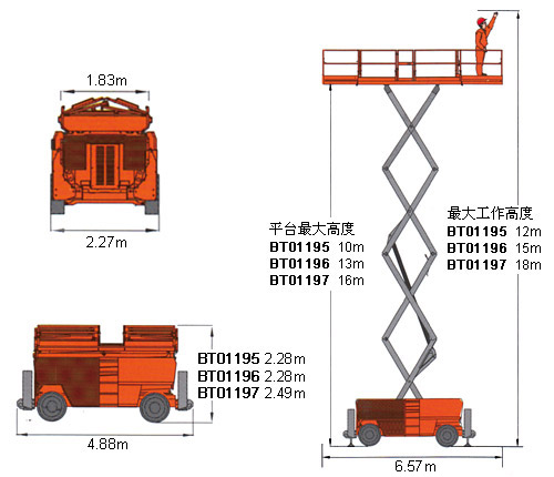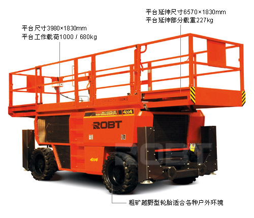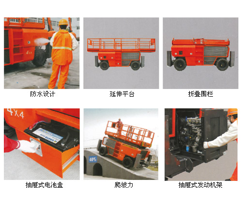 • 双向延升平台可以讯速铺开至作业点;• 业内最大的工作平台尺寸6.57m×1.83m;• 可折叠式围栏缩小了整机体积;• 自动调平液压支腿;• 40%的爬坡能力,4×4驱动可在不平粗糙的地面作业;• 全封闭的油管设计,避免意外发生,导致昂贵的油管更换;• 抽屉式发动机方便维护;• 抽屉式电瓶方便维护;• 故障代码自动显示方便检修。标准配置 • 比例控制 • 平台自锁门 • 实心轮胎 • 4×4驱动• 自动刹车系统 • 抽屉式发动机架 • 应急泵 • 紧急停止按钮• 油管防爆系统 • 倾斜保护系统 • 故障诊断系统 • 发动机重启保护• 蜂鸣器 • 喇叭 • 工作计时表 • 安全检修支撑杆• 折叠围栏 • 双向延伸平台 • 欧III排放发动机 • 频闪灯 • 液压油散热器