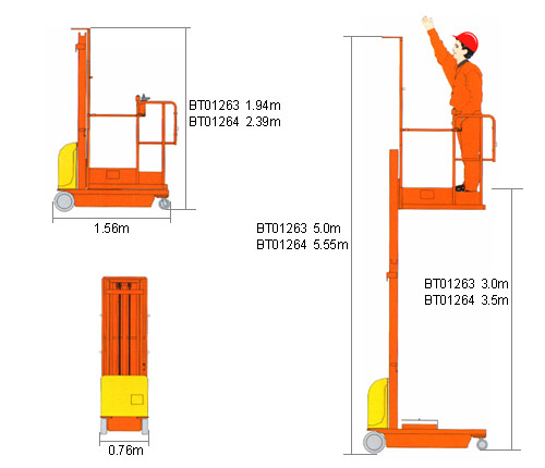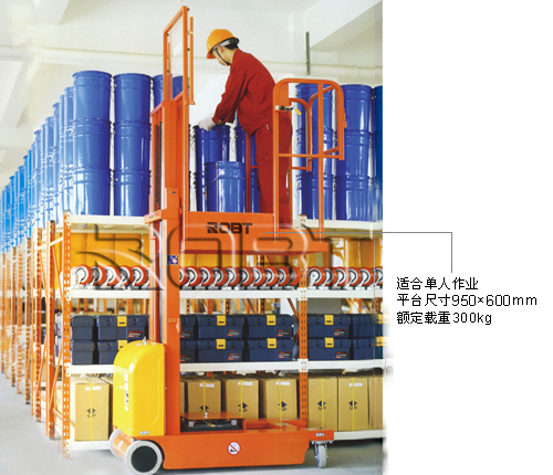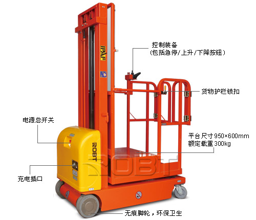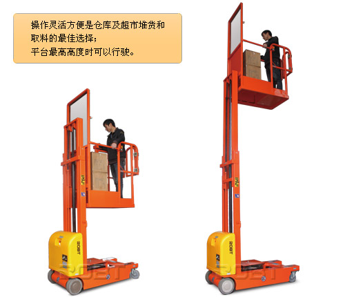 • 操作灵活方便是仓库及超市堆货和取料的最佳选择;• 平台最高高度时可以行驶;• 进口的电控系统反应敏捷,操控自如;• 配有标准电池和自动充电器;• 符合欧洲EN-280标准;• 提高的安全性和工作效率;• 设有紧急下降阀装置;• 设有故障自诊断功能,维修方便;• 25%的爬坡能力,能够流畅爬上斜面;• 业内最小的转弯半径(0°)及紧凑的设计(1.53m×0.70m)方便在狭小的空间作业;• 故障代码自动显示方便检修。• 建议室内使用标准配置• 比例控制 • 平台自锁门 • 全行程行走 • 无痕轮胎 • 4 ×2驱动 • 自动刹车系统 • 紧急下降系统 • 紧急停止按钮 • 油管防爆系统 • 故障诊断系统 • 倾斜保护系统 • 蜂鸣器 • 喇叭 •工作时间表 • 运输标准叉车孔 • 充电保护系统• 频闪灯选装配置• 超重传感器 • 平台工作灯 • 连接到平台的导气管