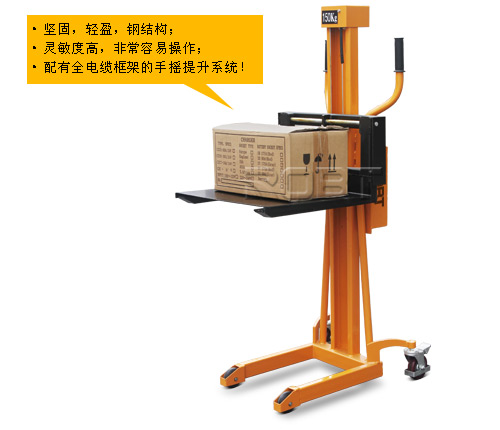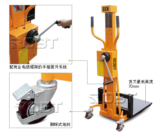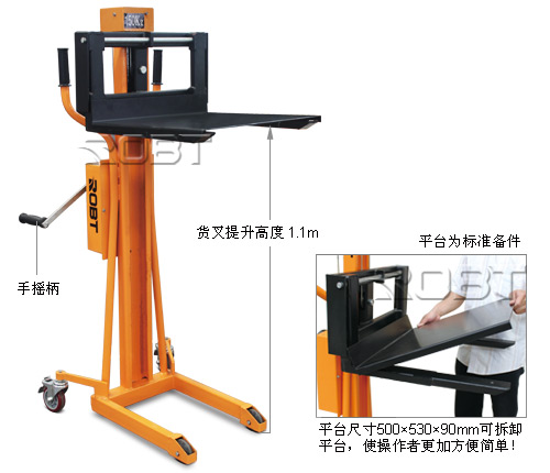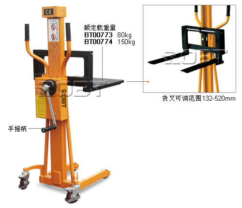 • 坚固,轻盈,钢结构;• 灵敏度高,非常容易操作;• 配有全电缆框架的手摇提升系统;• 货叉可调范围为132 毫米-520 毫米;• 平台为标准备件;• 注:将平台安装到2个货叉上时,货叉必须处于最大货叉宽度位置。
