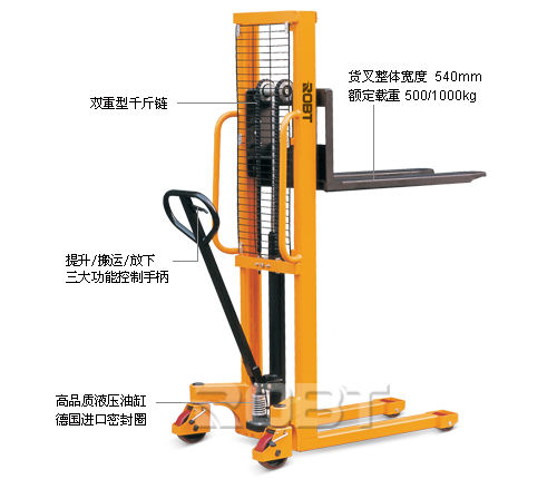 • 符合欧洲EN 1757-1:2001标准;• 高品质液压油缸,操作安全省力。德国进口密封圈,大大提高密封性能,降低维修成本;• 重型"C"型钢门架,更加坚固安全;• 可按客户需要提供可调货叉型手动液压堆高车;• 移动灵活,操作安全、省力。