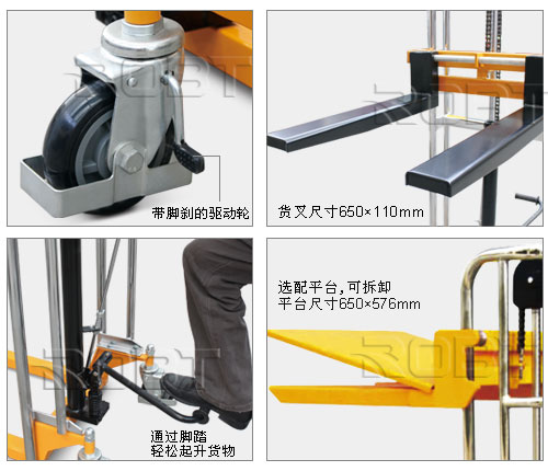 • 根据人体工程原理设计使得所有的操作都十分舒适;• 脚设有刹车装置,提高了在作业过程中的安全系数;• 脚踏起升,起升省力快速;• 造型美观,轻型设计,关键部位采用优质钢材,经久耐用;• 专为空间狭小搬运轻松货物设计,占地面积小,从而在车站火车站更显优势;• 用途广泛,适用于多种场合,可搬运、可升降;• 具有轻便、灵活的特性,可单人操作,适用于单人作业。