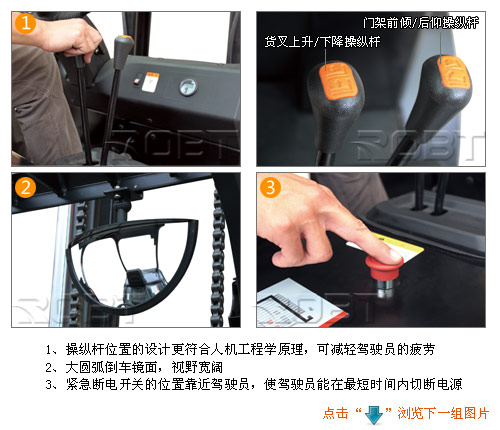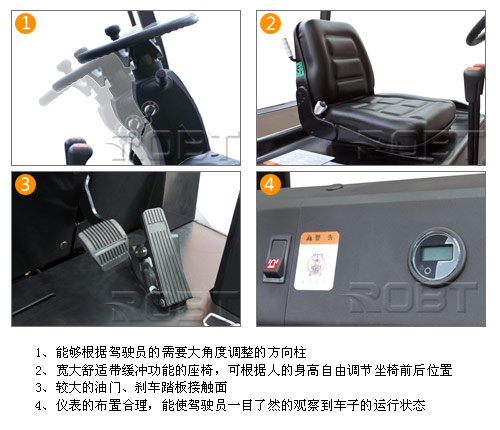 操控与安全 • 宽畅的操作空间。 • 能够根据驾驶员的需要大角度调整的方向柱。 • 双电机驱动,更高的操纵性。 • 操纵杆位置的设计更符合人机工程学原理,可减轻驾驶员的疲劳。 • 仪表的布置合理,能使驾驶员一目了然的观察到车子的运行状态。 • 较大的踏板接触面,超长的安全架扶手,独特的下扶手设计,使操作者上下车非常容易。 • 独特的侧扶手设计,使驾驶员在倒车时更具有安全感。 • 宽大舒适带缓冲功能的座椅。 • 大圆弧倒车镜面,视野宽阔。 • 宽视野门架,提高操作效率。 • 紧急断电开关的位置靠近驾驶员,使驾驶员能在最短时间内切断电源。