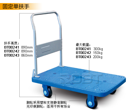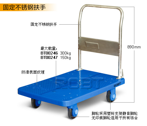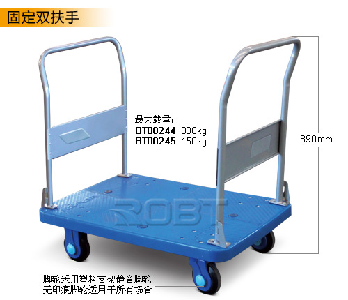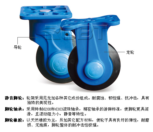 塑料车板: ·主材料由聚丙烯塑料俗称为“PP”,加上其它成份材料组成。重量轻,有韧性,抗冲击、耐腐蚀、防滑设计。 扶手: ·采用SPCC无缝钢管,厚度2.0mm。三重粉体涂装工艺而成。高档美观、耐用性强,可折叠或固定。 静音脚轮: ·轮架采用尼龙架或钢架加各种其它成份组成。耐腐蚀、韧性强、抗冲击,具有独特的美观性。 脚轮轴承: ·采用特制6200和6303滚珠轴承,精密轴承的游隙标准,使脚轮更具润滑,且滚动阻力小,静音等特性。 脚轮橡胶: ·以天然橡胶为主,另加其它配方材料,使轮子具有良好的弹性,耐磨损、无拖痕,脚轮整体的耐冲击性极强。