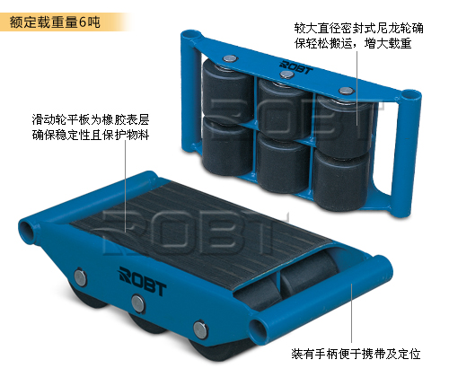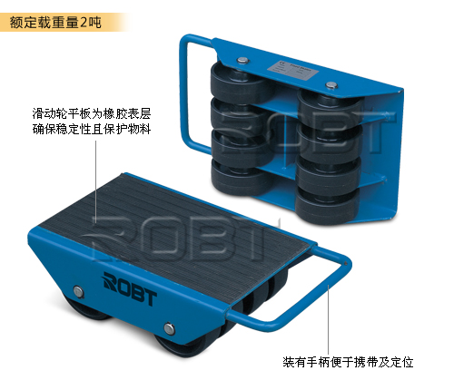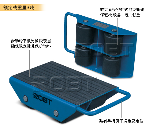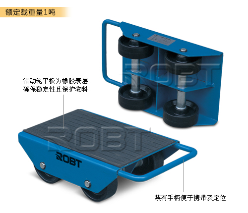 • 重物短距离移动• 任何时候需移动重载荷物料时都可使用滑动轮。可配合使用千斤顶或者带撬棍型滑动轮提起货物,便于滑动轮定位• 较大直径密封式尼龙轮确保轻松搬运,增大载重;亦可保护优质地板避免因重载荷而受损或油/润滑油污染• 滑动轮无需保养,且装有手柄便于携带和放置。滑动轮平板为橡胶表层确保稳定性且保护物料• 滑动轮具有非常广泛的使用范围,可适用于各类重型货物的移动• 用撬棍或千斤顶把货物撬起,便可放置滑动轮• 采用大直么尼龙轮增加载荷面积,便于移动,从而保护高质量地板免遭压刮或油污破坏