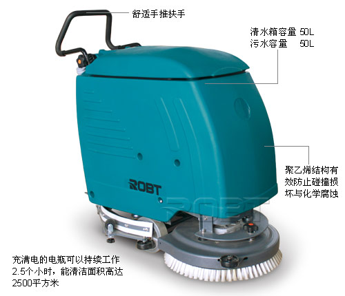 • 充满电的电瓶可以持续工作2.5个小时,能清洁面积高达2500平方米• 聚乙烯结构有效防止碰撞损坏与化学腐蚀• 各50L清水箱及污水箱,可持续工作40分钟• 掀开式水箱,把整个水箱掀开,便可清晰的看到里面的部件和电瓶• 限制电瓶过度充电,避免电瓶提早损坏,配置恒流恒压全自动充电器• 选配进口免维护干电瓶