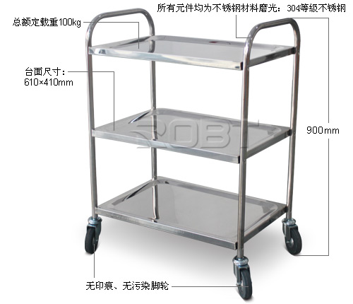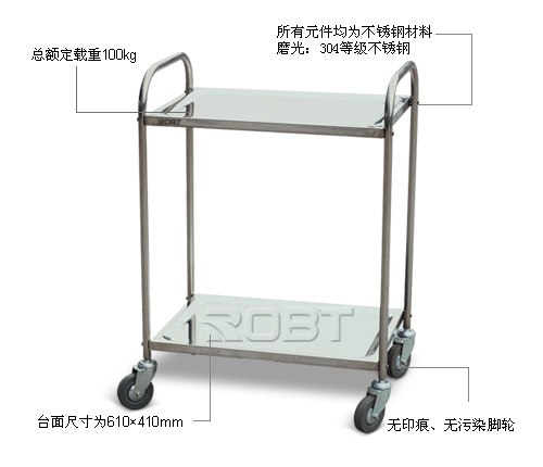 • 高品质范畴;• 重型设计,通用型小推车;• 所有元件均为不锈钢材料;• 磨光:304等级不锈钢;• 有2或3层架的选择,14种类型全焊成形的不锈钢材料;• 台面尺寸为:L×W 610×410mm;• 重型设计转向轮,无印痕、无污染。