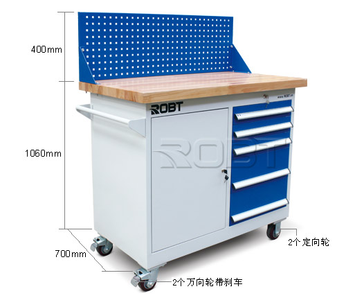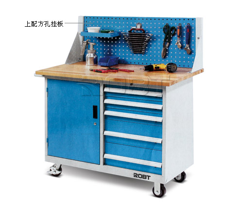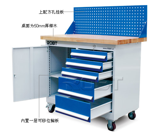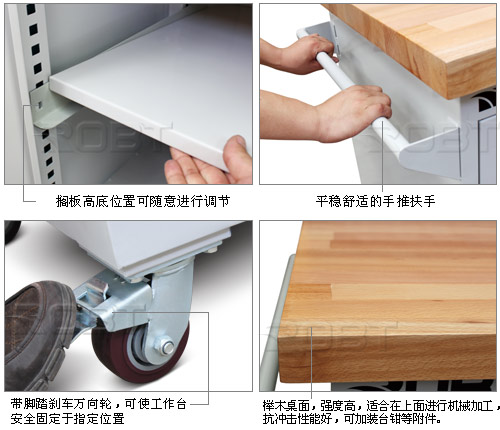 • 坚固钢板结构,表面喷粉• 复合桌面,表面为2mm高分子材料,耐碱、耐油、耐磨。桌面平整度过高,抗冲击性强。高强度橡胶包边,美观、实用,是应用广泛的桌面• 榉木桌面,强度高,适合在上面进行机械加工,抗冲击性能好,可加装台钳等附件• 导轨采用滚珠轴承,最大安全承重约100kg。镀锌搁板高度可调节• 上配方孔挂板,配单开门。预留电源线入孔• 四个脚轮,两个定向两个万向。万向轮带刹车• 安装简便,以未组装形式发送