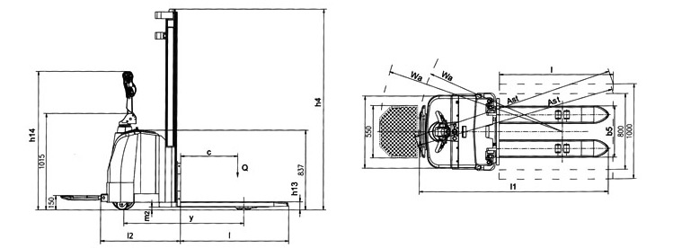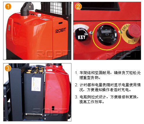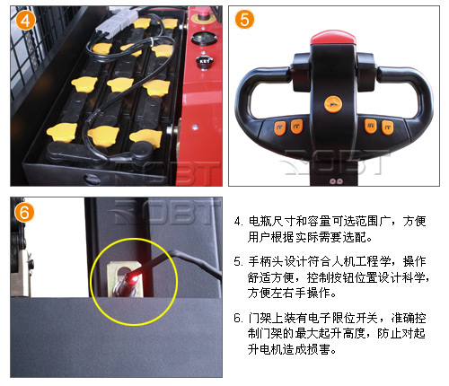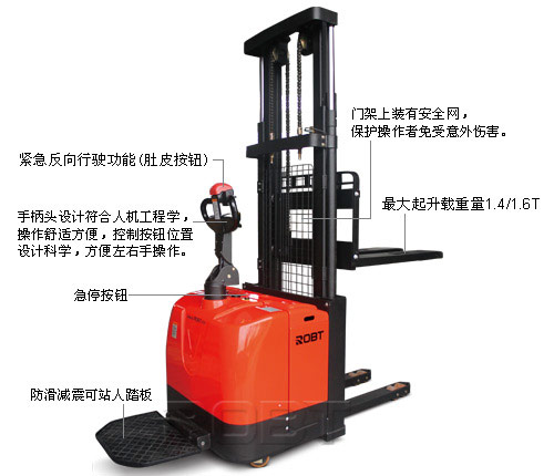 • 交流驱动系统使整车反应更迅速,控制更精确,运行更平稳,电瓶使用寿命更长。 • 特殊设计的交流驱动电机,提供更强动力。 • 使用最新的电子转向手柄,能有效的降低工作所需的力度和强度。极大减轻转向所需力量,提高驾驶的稳定性和舒适性。 • 车架结构坚固耐用,确保货叉轻松处理重型货物。 • 计时器和电量表随时显示电量使用情况,方便通知操作者适时充电。 • 电瓶侧拉式设计,方便维修和更换,提高工作效率。 • 电瓶尺寸和容量可选范围广,方便用户根据实际需要选配。 • 手柄头设计符合人机工程学,操作舒适方便,控制按钮位置设计科学,方便左右手操作。 • 门架上装有电子限位开关,准确控制门架的最大起升高度,防止对起升电机造成损害。 • 门架采用德国进口槽钢,结构坚固耐用,确保货叉的起升和下降稳定安全。 • 门架上装有安全网,保护操作者免受意外伤害。 • 双油缸起升设计,避免摇晃,保证货物平稳上升。 • 紧急反向行驶功能,在向后行驶过程中,一旦操作者背后碰到物体,操作者会自然反应用身体撞击手柄反向按钮,车子立即紧急反向行驶,使操作者避免受到伤害。
