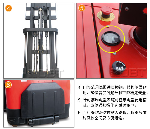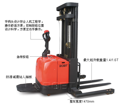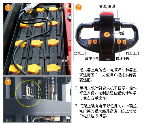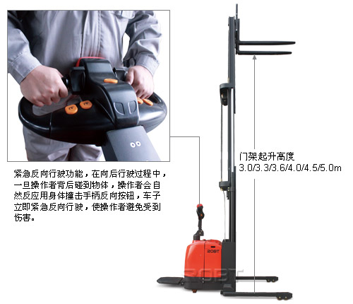 • 交流驱动系统使整车反应更迅速,控制更精确,运行更平稳,电瓶使用寿命更长。 • 特殊设计的交流驱动电机,提供更强动力。 • 使用最新的电子转向手柄,能有效的降低工作所需的力度和强度。极大减轻转向所需力量,提高驾驶的稳定性和舒适性。 • 车架结构坚固耐用,确保货叉轻松处理重型货物。 • 计时器和电量表随时显示电量使用情况,方便通知操作者适时充电。 • 电瓶侧拉式设计,方便维修和更换,提高工作效率。 • 电瓶尺寸和容量可选范围广,方便用户根据实际需要选配。 • 手柄头设计符合人机工程学,操作舒适方便,控制按钮位置设计科学,方便左右手操作。 • 门架上装有电子限位开关,准确控制门架的最大起升高度,防止对起升电机造成损害。 • 门架采用德国进口槽钢,结构坚固耐用,确保货叉的起升和下降稳定安全。 • 门架上装有安全网,保护操作者免受意外伤害。 • 双油缸起升设计,避免摇晃,保证货物平稳上升。 • 紧急反向行驶功能,在向后行驶过程中,一旦操作者背后碰到物体,操作者会自然反应用身体撞击手柄反向按钮,车子立即紧急反向行驶,使操作者避免受到伤害。