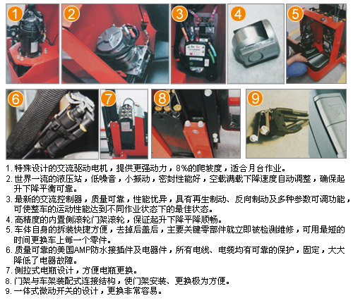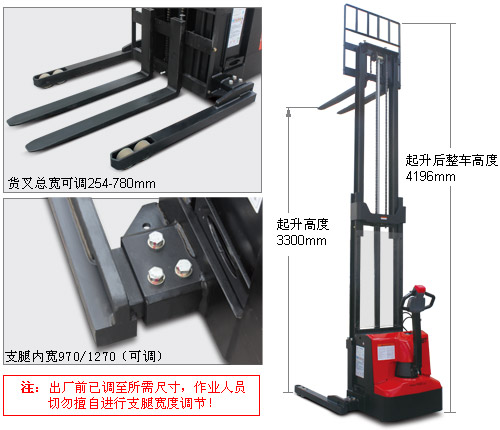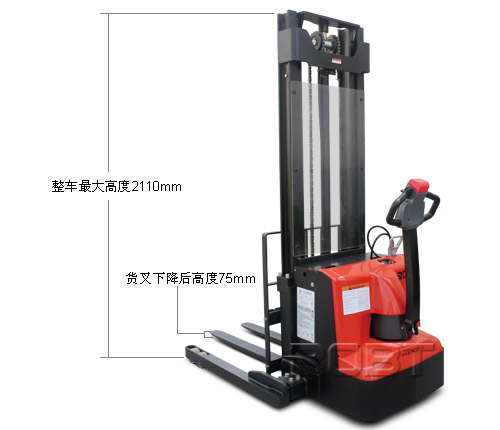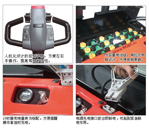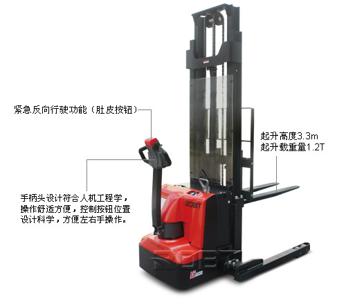 高性能• 交流驱动系统使用整车反应更迅速,控制更精确,运行更平稳,电瓶使用寿命更长。• 特殊设计的交流驱动电机,提供更强动力,8%的爬坡度,适合月台作业。• 世界一流的液压站,低噪音,小振动,密封性能好,空载满载下降速度自动调整,确保起升下降平衡可靠。• 最新的交流控制器,质量可靠,性能优异,具有再生制动、反向制动及多种参数可调功能,可使整车的运动性能达到不同作业状态下的最佳状态。• 高精度的内置侧滚轮门架滚轮,保证起升下降平降顺畅。• 质量可靠的美国AMP防水接插件及电器件,所有电线、电缆均有可靠的保护,固定,大大降低了电器故障。易操作• 人机化设计的手柄头,美观、简洁,所有的操作功能均可在手柄上简单按钮轻松实现。• 人机化设计的控制手柄,方便左右手操作,提高驾驶舒适性。• 较长的操纵手柄,大大降低了操纵车子所需力量,使操纵更轻便。• 货叉和叉腿宽度可调,适用各种托盘作业。• 慢速行驶功能,将手柄处于近垂直状态,行驶速度会自动降低,便于在狭窄空间内实现精确作业。• 侧拉式电瓶设计,方便电瓶更换。更安全• 起升缸底部安装防爆阀,即使油管爆裂,门架也不会快速下降。• 紧急反向行驶功能,在向后行驶过程中,一旦操作者背后碰到物体,操作者会自然反应用身体撞击手柄反向按钮,车子立即紧急反向行驶,使操作者避免受到伤害。• 防滑制动功能,使车子在失控或者斜坡行驶时,防止其下滑。• 紧急断电开关作为标准配置,只需按下紧急停止按钮就可以切断所有电源,车子立即停止。• 起升多重限位,更安全。• 货叉起升0.5m后,车辆运行自动切换至慢速模式,更安全。易维护• 车体自身的拆装快捷方便,去掉后盖后,主要关键零部件就立即被检测维修,可用最短的时间更换车上每一个零件。• 直立式电机的使用,使电机、刹车等的检测、维修异常直接方便,维修性能大大好于横置式电机。• 控制器自我诊断系统,通过手持单元显示故障代码,解决故障更方便。• 交流驱动电机,无碳刷,基本无需维修,大大减少维护成本。• 一体式微动开关的设计,更换非常容易。• 计时器和电量表为标配,方便提醒操作者适时充电。• 门架与车架装配式连接结构,使门架安装、更换极为方便。