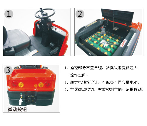 | • 在现代流水线物料搬运,及大型工厂区间物料搬运中,物料往往存放在挂车中,需要牵引车来解决不同区间高效物料运输。罗倍拓电动系列坐驾式及站驾式牵引车很好地满足了这一需求。 • 时尚有趣的外形设计给传统工业车辆带来清新的风潮。 • 常用于机场、车站、车间、仓库内货物牵引 AC电控及电机 • 免维护AC驱动电机,大扭矩,爬坡能力强,大牵引力,动力强劲,确保车子在不平整的路面和斜坡上依然能平衡行驶,电瓶使用寿命更长。 • 先进的AC控制器,具备再生制动功能,延长电池有效使用时间。 操控性 • 操控部分布置合理,给操纵者提供超大操作空间。 • 宽大舒适带缓冲功能的座椅,驾驶舒适,运载能力强,有效减轻疲劳度 • 较大的踏板接触面,超长的安全扶手,给操作者提供安全舒适的操控性能。 • 能够根据驾驶员的需要大角度调整方向柱。 • 紧急制动开关位置合理,使驾驶员能在最短时间内切断电源。 • 方向盘、换向开关、手刹、脚踏板等布置与电动平衡重叉车完全一致,为一人驾驶多种车辆的驾驶员提供方便。 • 超大电池箱设计,可配备不同容量电池。 • 车尾微动按钮,有效控制车辆小范围移动。 • 大直径充气轮胎,室内、外都可使用 • 低重心设计,行驶时非常稳定 • 电子转向提供精确的控制,自动制动使得操作更安全 刹车系统 • 电机在刹车减速过程中,起到制动作用。 • 电磁制动实现了较为有保障的驻车制动,能保证车辆在斜坡上同样能安全停车。 • 电磁刹车,电机制动和液压制动的三重保障,提高了安全性降低了损耗,使整车拥有更长的使用寿命。 维护与保养 • 可大幅度开启电池箱盖,方便日常维护保养 • 防尘防水AMP接插件和耐热耐蚀耐磨的导线应用,延长了电气系统使用寿命。 • 驱动电机底部增加防水防尘罩壳,有效防止地面沙尘积水对电机的破坏。 • 仅拧去4颗螺丝,及可完全卸下后罩,维护保养轻松便捷。