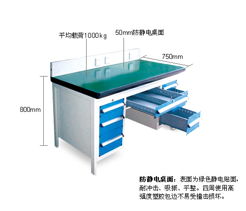 • 采用国际先进的全组装式桌架计结构,桌架稳固,拆装简便;• 有多种腿型可供选择,满足不同的承重使用要求;• 提供多达9种的桌面满足不同用户的使用需求,每种桌面更有不同的厚度满足载重要求;• 在桌面最大规格尺寸范围内,工作台上可随意变化;• 桌面下可根据需求配置各式工具柜;• 工作桌上可根据需求进行各种各样的配置,主要的配置有灯架、方孔/百叶挂板、电器盒、搁物板等。• 防静电桌面:表面为绿色静电贴面,耐冲击、吸振、平整。四周使用高强度塑胶包边不易受撞击损坏。• 安装简便,以未组装形式发送