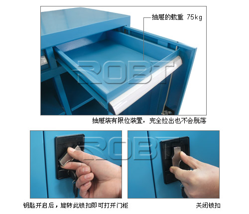 ·柜体采用三片式搭接设计,采用优质冷轧钢板经过先进数控设备剪,冲,折、焊等工序制作成型,并通过先进的自动化静电喷涂工艺进行表面处理,美观、坚固、耐用。 ·采用钢板折弯结构,灵活轻巧的滑轨系统,中央门锁结构,任意的内分制式抽屉,还可配分类盒和分类槽,并设有安全扣,防止抽屉脱落。 ·抽屉内横竖板可自由调节,随意分隔用以存放不同大小的物品。 ·抽屉装有限位装置,完全拉出也不会脱落;还可配置安全扣,使抽屉不会自行滑出,使用安全可靠。 ·整个工具抽屉用一把锁锁上全部抽屉,使用简捷方便。 ·产品防腐、防锈、质感好,能满足工厂的不同用途。 ·在柜体顶部可选配:绿色条纹胶皮、围边、图板、活动背板、方孔挂板或百叶挂板、增加工具柜的使用功能 ·柜底可选择:平垫、矩形垫、角形垫、调节垫,适应用户不同的放置要求 ·工具柜可选配脚轮:安装脚轮后,即成为移动工具矩(即工具车)