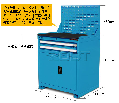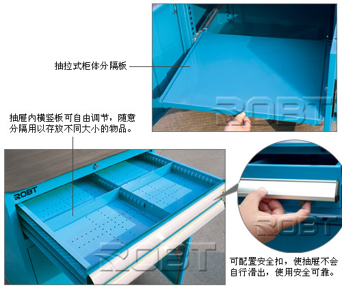 ·柜体采用三片式搭接设计,采用优质冷轧钢板经过先进数控设备剪,冲,折、焊等工序制作成型,并通过先进的自动化静电喷涂工艺进行表面处理,美观、坚固、耐用。 ·采用钢板折弯结构,灵活轻巧的滑轨系统,中央门锁结构,任意的内分制式抽屉,还可配分类盒和分类槽,并设有安全扣,防止抽屉脱落。 ·抽屉内横竖板可自由调节,随意分隔用以存放不同大小的物品。 ·抽屉装有限位装置,完全拉出也不会脱落;还可配置安全扣,使抽屉不会自行滑出,使用安全可靠。 ·整个工具抽屉用一把锁锁上全部抽屉,使用简捷方便。 ·产品防腐、防锈、质感好,能满足工厂的不同用途。 ·在柜体顶部可选配:绿色条纹胶皮、围边、图板、活动背板、方孔挂板或百叶挂板、增加工具柜的使用功能 ·柜底可选择:平垫、矩形垫、角形垫、调节垫,适应用户不同的放置要求 ·工具柜可选配脚轮:安装脚轮后,即成为移动工具矩(即工具车)