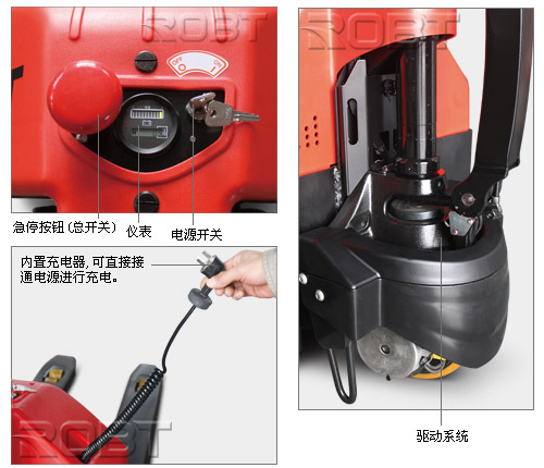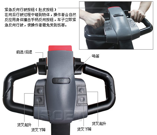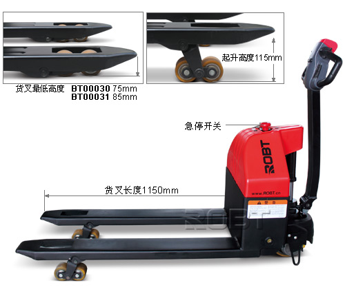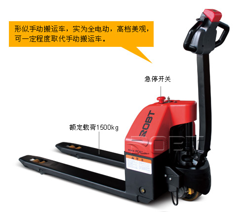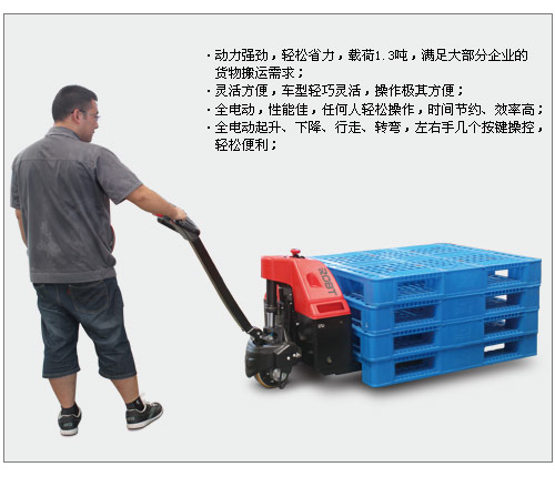 劲: ·动力强劲,轻松省力,载荷1.3吨,满足大部分企业的货物搬运需求; ·坚固耐用,高效稳定的部套件,保证整车经久耐用。 精: ·外形靓丽,高档美观,半包外型设计,简约而不简单,整车美观大气; ·结构精致,细节出色,内外部结构设计精湛,每个细节都精益求精; ·维护方便,模块化生产,易拆装维护。 微: ·体积小巧,节省空间,尺寸小巧,在很小的通道亦能顺利通行; ·灵活方便,车型轻巧灵活,操作极其方便; ·经济节能,性价比极高,60AH免维护电瓶。 ·性能:全电动,性能佳,任何人轻松操作,时间节约、效率高; ·操控:全电动起升、下降、行走、转弯,左右手几个按键操控,轻松便利; ·安全:安全理念设计,充分考虑操控者的操控性,满载亦很安全; ·维护:模块化生产,易拆装维护;电瓶免维护; ·其它:形似手动搬运车,实为全电动,高档美观,可一定程度取代手动搬运车。