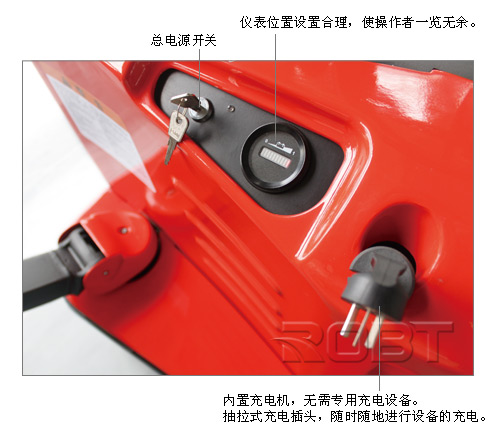 易操作: ·充分考虑人机工程的手柄头设计,各功能按钮方便轻松操作; ·较长的操作手柄,大大降低了操纵车子所需力量,使操纵更轻便; ·紧凑设计,超小作业半径; ·偏置操控,大大提高作业视野; ·内置充电机,无需专用充电设备。