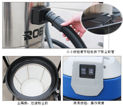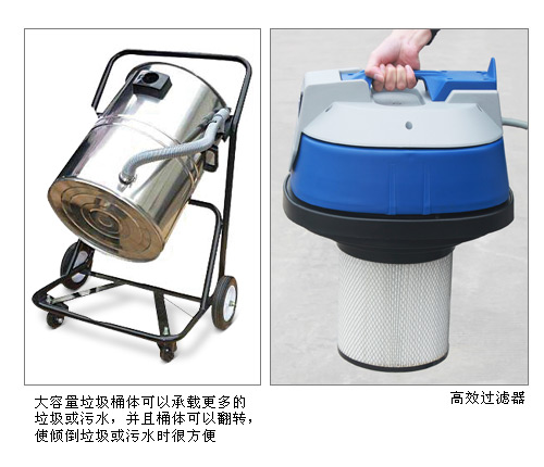 | ·配备强劲静音型电机(美国阿美德格(AMETEK)专业电机)。吸力大,功效强。其使用寿命是普通商用吸尘器电机的三倍以上。 ·坚固的不锈钢桶体及金属车架在工业使用中有更好的抗撞击性和耐用性。普通的吸尘器往往是塑料车架,时间长了容易龟裂。 ·大容量垃圾桶体可以承载更多的垃圾或污水,并且桶体可以翻转。使倾倒垃圾或污水时很方便。 ·标配的高效过滤器包含尘隔,达到双层过滤,0.3微米颗粒过滤精度达到99.99%,是清理金属粉尘、塑料粉尘等细小粉尘的理想机型。 ·采用前轮PU轮,后轮橡胶轮,脚轮坚固耐用,机器推动时静音效果好,能适用于环境恶劣的重工业场所。普通吸尘·器的脚轮很多是PVC材料制作,时间一长或者在环境恶劣的场所使用很快就会损坏。 ·适用于工厂地面吸尘及工作台面吸尘,是清理金属粉尘、塑料粉尘等细小粉尘的理想机型。 ·适合使用的工厂有:机械加工厂、电子厂、制药厂、化工厂、食品厂等等。 ·随机配件:软管,钢管,扁吸嘴,圆毛刷,吸尘扒,吸水扒。