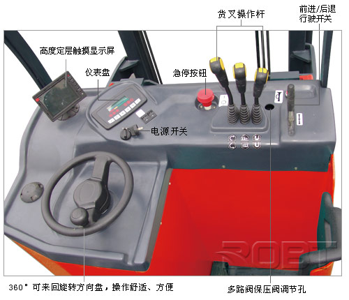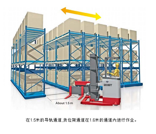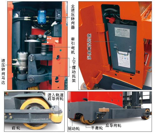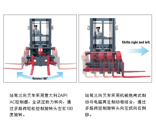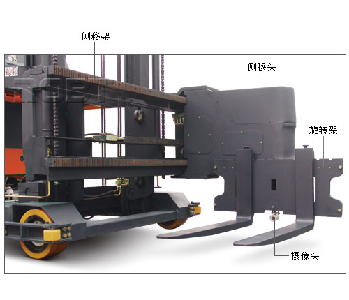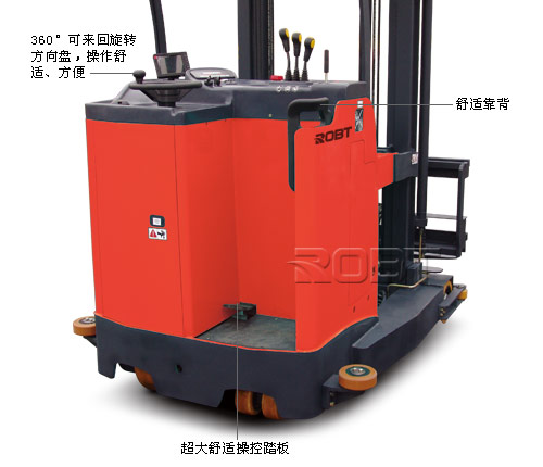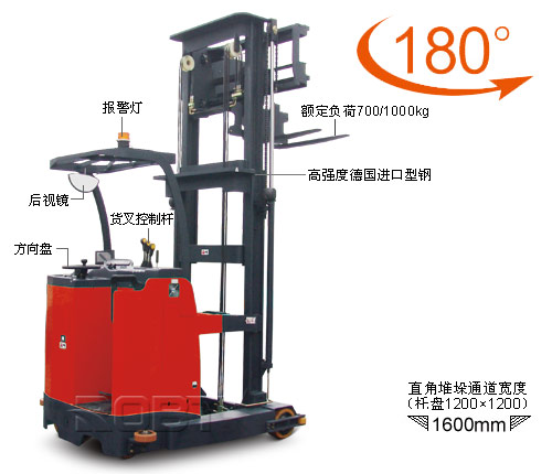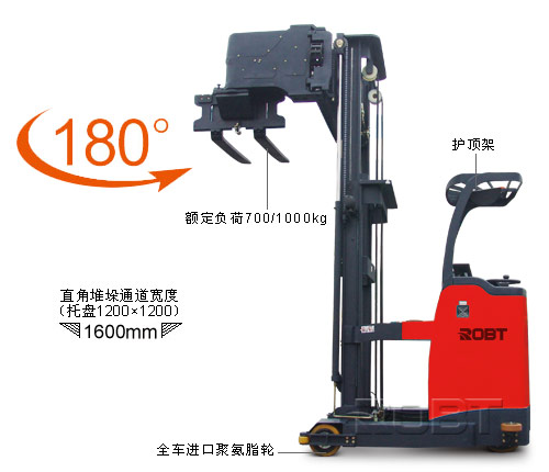 ·优越的交流48V系统,低电流高效率,使得整车效率大大提高; ·灵活的旋转侧移装置使得作业得心应手,在寸土如金的时代,为客户大大节省可利用空间。 ·采用ZAPI 新型全交流控制器、德国进口ZF变速箱,高效率,低噪音。 ·是一款多功能、高适应性车型,完全满足窄巷道,宽巷道及平台的使用要求。 ·货叉的上升、下降、左移、右移、左旋、右旋等功能都在手动模式下完成。 ·在自动模式下,通过人机界面能实现货物存取准备、高度定层等操作,在满足纵向定位的条件下,还可实现自动存取货。 ·人机界面在本机上不仅作为一种输入设备,而且还能实时显示转向轮、货叉的方位及货叉的横向位置及高度、货物的重量等数据。 ·配备了独立的视频显示系统,无论货叉处于何种高度,操作人员都能够近距离的观察货物的种类、形状及位置。 ·高强度德国进口型钢;全车进口聚氨脂轮