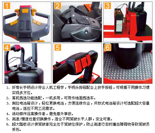 更安全 ·活动部件远离操作者,避免意外事故。 ·高速/慢速任意切换操作,适合不同驾驶水平人群,安全可靠。 ·双重扶手保证,操作者在任何站立位都得到足够支撑保护。 ·紧急反向行驶功能,使操作者避免受到伤害。 ·简单可靠的电池接插把手设计,必要时可轻松全车断电,避免紧急事 ·防滑弹性脚垫设计,安全舒适。 ·超大踏板设计使驾驶者完全处于驾驶位保护,防止高速行走时撞击障碍物导致驾驶员受伤。