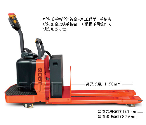 易操作 ·轮架金属导轮设计,进出空托盘与轻型车相比毫不逊色。 ·折弯长手柄设计符合人机工程学,手柄头按钮配合上扶手按钮,可根据不同操作习惯实现多方位,全视野的操作,·长时间工作安全舒适。 ·专门选配高强度高速轮胎,性能优越。 ·离机拣选功能选配,一机多用,可用作地面拣选车。 ·侧拉电池箱设计,轻松更换电池,方便连续作业,开放式电池箱设计可选配超大容量电池,适应不同工况需求。