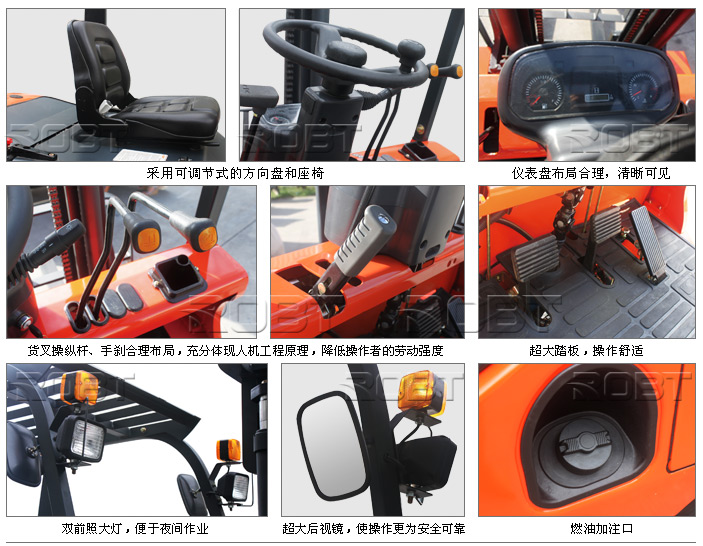 ·整车外观造型美观大方,采用最新的人机工程设计,操作舒适、安全、高效。技术性能方面能够满足国内、外不同客户的需求。采用可调节式的方向盘和座椅,各操纵系统合理布局,充分体现人机工程原理,降低操作者的劳动强度。发动机全浮式减震装置,转向桥弹性连接,低扭矩转向器使原地转向更轻松;悬浮式高强度内置隔热隔音材料的整体式机罩,底板操作空间简洁宽敞,保障了整机操作的舒适性。
