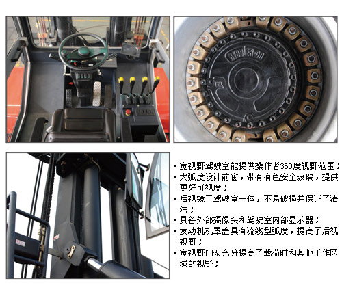 超越的能见度和很好的维修性 ·宽视野驾驶室能提供操作者360度视野范围; ·大弧度设计前窗,带有有色安全玻璃,提供更好可视度; ·后窗采用一体式玻璃设计; ·最大限度使用玻璃材质,最大幅度增加了视野; ·后视镜于驾驶室一体,不易破损并保证了清洁; ·具备外部摄像头和驾驶室内部显示器; ·发动机机罩盖具有流线型弧度,提高了后视视野; ·宽视野门架充分提高了载荷时和其他工作区域的视野; ·能向后打开的机罩和可倾翻的司机室,使叉车的维护、保养更方便。