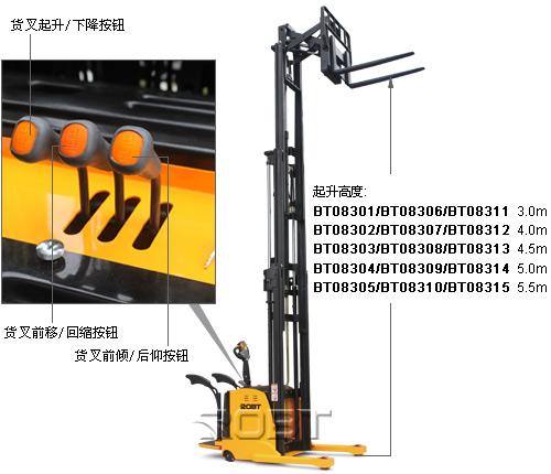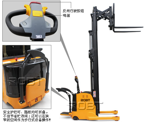 • 货叉可以前后伸缩,剪叉伸缩距离在500mm以上; • 转弯半径小,适合在狭窄的通道内使用; • 作业时货叉伸缩平稳,无冲击; • 改良后的设计进一步提高了额定载重量和起升高度; • 护栏为选配。