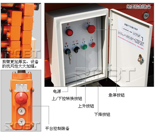 | • 点动控制升降,平台上下双向控制升降; • 控制电压为直流24V,保证操作人员的安全; • 控制电源处设置电锁,设有上控下控转换开关; • 设备的升降行程可以通过升降机本身带的升程限制开关,自动控制升高高度; • 系统带有应急下降阀,当系统在工作时,由于突然断电,可以使升降设备安全下降,且操作机构为外置式,操作方便; • 电气控制系统设有双接触器、双限位开关,最大限度保护操作安全; • 底盘设置可外拉式活动抽屉,便于维护、维修及保养; • 平台升降剪叉部分采用宽截面锰钢矩形管,使得运行更加平稳、可靠; • 底盘设置标准运输叉车孔; • 平台对角处设置2个专用安全带挂钩,便于高空作业。 • (注:BT01548 款为经济型,轻便型的,小轮、旋转支腿、臂架为窄型的矩形管) • ROBT为保障您的作业安全,高空平台类产品,每台免费附送一套安全帽和安全带。