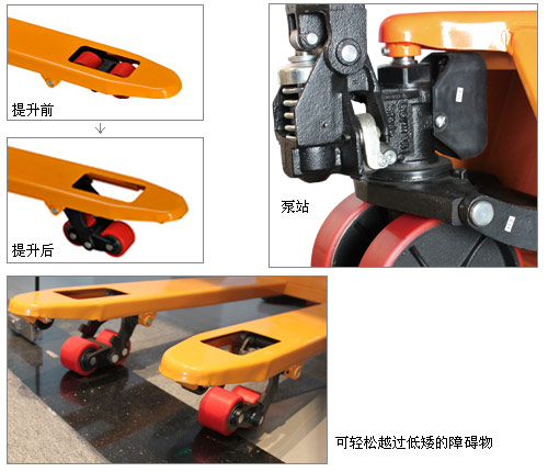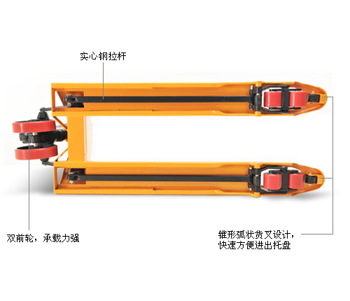 • 宝钢优质钢板打造,表面静电喷塑• 整体铸造式油缸,外形美观,坚固耐用• 采用进口密封圈,镀铬活塞杆• 内部溢流阀提供过载保护,有效避免超载使用,降低维修费用• 运动部位装载有合金衬套,能够吸收偏载,耐磨损,延长使用寿命且更换方便• 一体式铸造轮架,配置双前轮,承载能力强• 装有前后导向轮,保护前轮免受撞击,延长轮子使用寿命• 特殊货叉总宽可以制作:450mm• 特殊叉长可以制作:800、900、1000、1500、1800、2000mm• 安装简便,以未组装方式发送