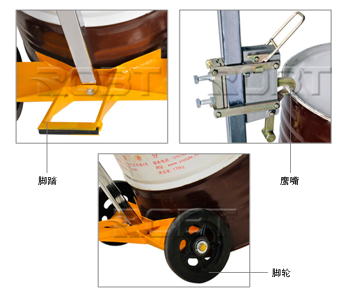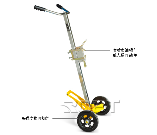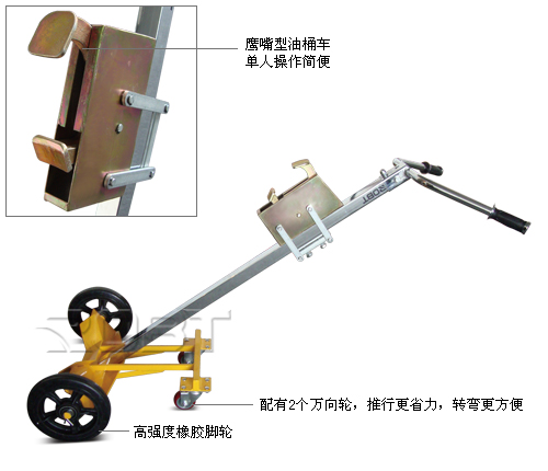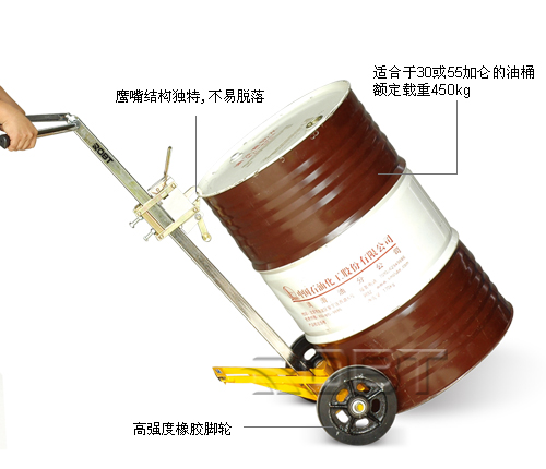 • 可单人操作,且操作简便• 鹰嘴结构独特,不易脱落• 10” 橡胶轮减轻操作者疲劳• 安全运送和抓取油桶• 采用优质钢材,高于国内同行业标准• 绝对环保,采用环保的粉体涂装技术• 适合钢制油桶和塑料油桶的搬运