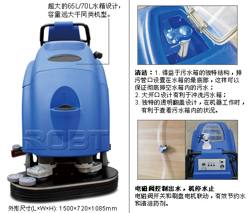| ·集中式面板操控,灵活自如; ·大木箱设置65L/70L,工作更有效率; ·水箱采用工程塑料材质,坚固耐用; ·自动装卸刷盘设计,方便使用; ·金属齿轮驱动刷盘,动力更强劲; ·刷盘电机配置了Trombetta直流接触器,安全可靠; ·13寸双刷,清洁效率更高 ·过载保护器替代传统的保险丝,易于售后维护; ·意大利进口阿美德格吸水电机,吸力更强劲; ·美国进口吸水胶条,吸水效果更好; ·电磁阀控制,机停水停; ·电池电量显示功能,工作时间累计,便于售后服务。