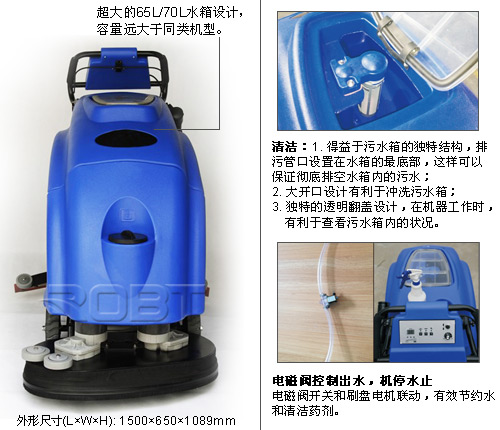 | ·集中式面板操控,灵活自如; ·大水箱设置65L/70L,工作更有效率; ·水箱采用工程塑料材质,坚固耐用; ·可自动调节的操作手柄,操作更舒适; ·超大的电池存储空间,可以放置多种规格的电池; ·自动装卸刷盘设计,方便使用; ·金属齿轮驱动刷盘,动力更强劲; ·刷盘电机配置了Trombetta直流接触器,安全可靠; ·过载保护器替代传统的保险丝,易于售后维护; ·意大利进口阿美德格吸水电机,吸力更强劲; ·美国进口吸水胶条,吸水效果更好; ·英国进口CPU控制器,质量更可靠; ·电磁阀控制,机停水停; ·电池电量显示功能,工作时间累计,便于售后服务。