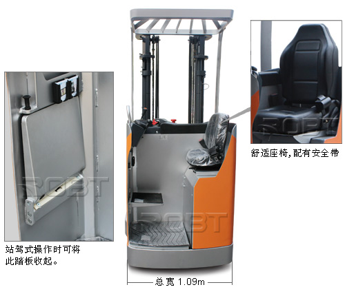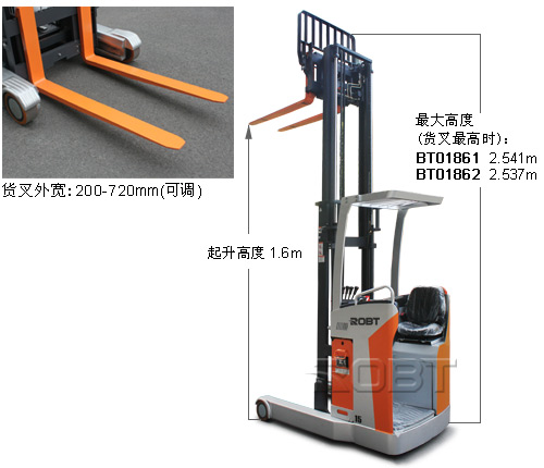 ·具有平衡重式叉车和电动堆垛机的共同特征,这两种性能的结合,使得这种叉车具有操作灵活性和高载荷的优点,同时体积和自重不会增加很多,可以节省空间,减少转弯半径,适合于通道较窄的室内仓库作业。 ·有利于设计仓库时采用较小的通道,可以提高仓库的利用效率。
