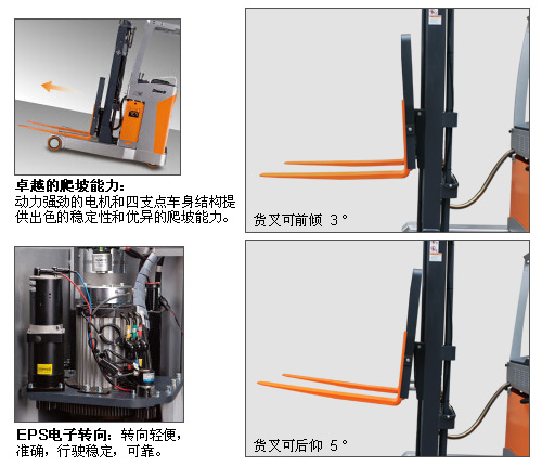 强劲动力,高效作业! ·大功率设计,提供强劲动力源;多功能使用,保证高效循环作业。 ·卓越的爬坡能力:动力强劲的电机和四支点车身结构提供出色的稳定性和优异的爬坡能力。 ·门架前后移:更便于取货,多环境使用。 ·货叉前后倾:保证取料方便,运输稳定。 ·EPS电子转向:转向轻便,准确,行驶稳定,可靠。