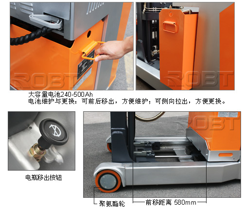 安全可靠;维护方便! ·符合国际安全标准,提供更多保护;方便维护保养,省时、省力、省钱。 ·宽视野护顶架:防止异物下落,提供安全防护。 ·舒适踏板:驻车制动、人知感应、减震功能,全方位保护。 ·电池维护与更换:可前后移出,方便维护;可侧向拉出,方便更换。 ·USB充电接口:个性化选择,可为手机及电子产品充电。