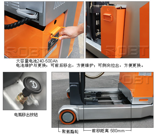 安全可靠;维护方便! ·符合国际安全标准,提供更多保护;方便维护保养,省时、省力、省钱。 ·宽视野护顶架:防止异物下落,提供安全防护。 ·舒适踏板:驻车制动、人知感应、减震功能,全方位保护。 ·电池维护与更换:可前后移出,方便维护;可侧向拉出,方便更换。 ·USB充电接口:个性化选择,可为手机及电子产品充电。