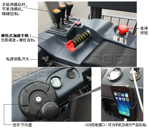 靓丽外形,操控优秀!最舒适的前移式叉车! ·工业造型设计,符合人机工程学;操控轻便自如,降低工作疲劳强度。 ·迷你方向盘:转向轻便,舒适,狭小空间内自由转向。 ·摩托式加速手柄:无极调速,操控自如。 ·多路阀操纵杆:可单指操控,精确控制。 ·可调节辅助踏板:可按个人使用习惯调节。 ·柔软舒适的托垫,有效降低操作者的疲劳。 ·自由选择适合您的乘驾方式,站驾or座驾。