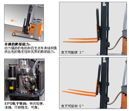 强劲动力,高效作业! ·大功率设计,提供强劲动力源;多功能使用,保证高效循环作业。 ·卓越的爬坡能力:动力强劲的电机和四支点车身结构提供出色的稳定性和优异的爬坡能力。 ·门架前后移:更便于取货,多环境使用。 ·货叉前后倾:保证取料方便,运输稳定。 ·EPS电子转向:转向轻便,准确,行驶稳定,可靠。