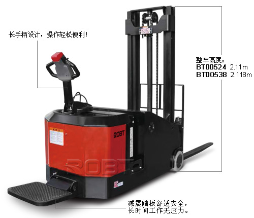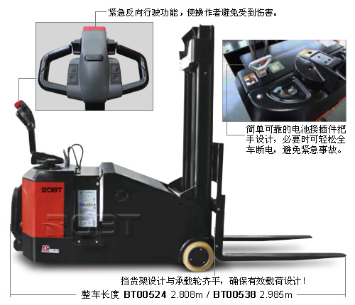 易维护: ·AC电机,免于维护; ·配置计时器和电量表,方便提醒操作者适时充电,保护电瓶; ·机体拆装便捷,仅拧下4颗螺钉卸下后盖,即可对主要关键零部件进行检测、维修及更换; ·压配式承载轮,降低维护费用; ·直立式电机的使用,使电机、刹车等的检测、维修直接方便,维修性能大大好于横置式电机; ·控制器自我诊断系统,通过手持单元显示故障代码,解决故障更方便; ·门架与车架装配式连接结构,使门架安装、更换极为方便; ·低电压自动保护,延长电瓶寿命。