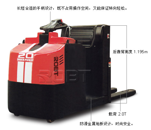 操控性: ·防滑金属地板设计,时尚安全; ·脚踏开关设计位置合理,操作简便; ·宽大舒适的操作空间,减震装置设计完善,提高操纵舒适性; ·长短合适的手柄设计,既不占用操作空间,又能保证转向轻松; ·速度可达12KM/H,提高拣选效率; ·侧拉电池箱设计,轻松更换电池,方便连续作业; ·简单可靠的电池接插件把手设计,必要时可轻松全车断电,避免紧急事故; ·标配电子转向,适应不同操作人群需求; ·定速行走按钮设计,无需上下车实现随机拣选。