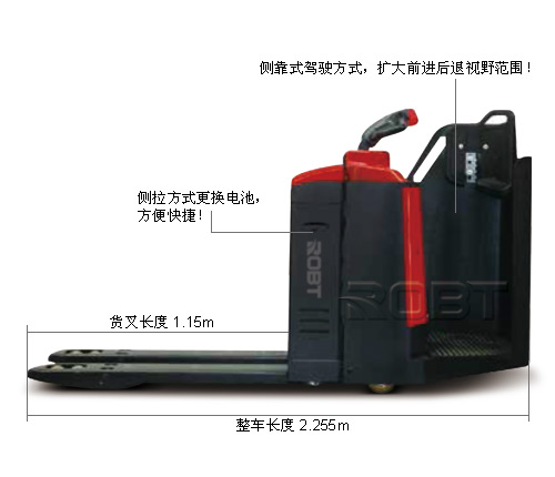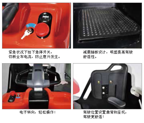 更安全: ·驾驶位置半包围设计,行驶更安全; ·侧靠式驾驶方式,扩大前进后退视野范围; ·脚踏式安全开关,防止行走误操作; ·松开行走开关实现自动制动和反向电流制动,驾驶更安全; ·紧急状况下拍下急停开关,切断全车电流,防止意外发生。