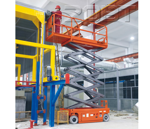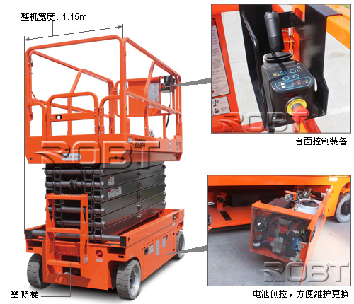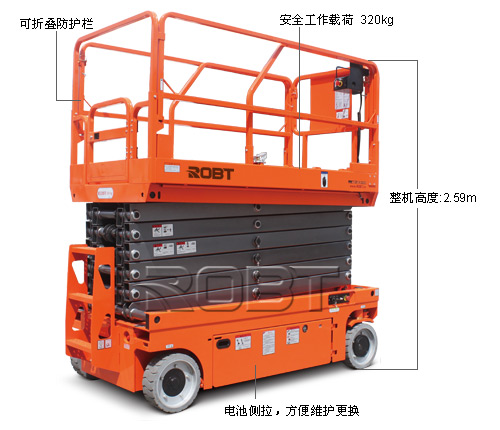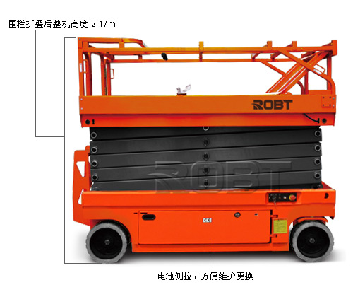 可选配: • 超重传感器 • 连接到平台的AC电源 • 平台工作灯 • 连接到平台的导气管 • 建议室内使用 • ROBT为保障您的作业安全,高空平台类产品,每台免费附送一套安全帽和安全带。