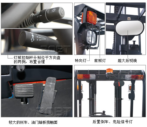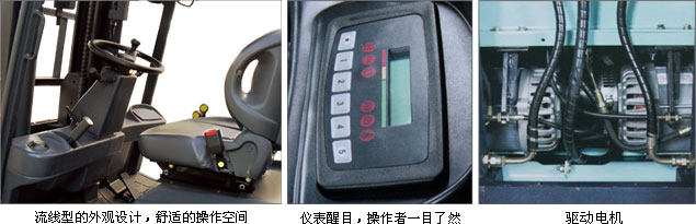 ·采用意大利ZAPI,电控系统成熟可靠; ·AC交流无碳刷免维护电机,节省维护保养的时间和成本; ·采用MOSFET行走起升控制器,使叉车行走起升控制精确平稳,具有再生制动、反接制动、坡道防下滑等功能,操纵性能优良; ·采用DC/DC转换器,电压输出更稳定,延长了电气元件使用寿命,特别是提高蓄电池的使用寿命; ·电气系统采用与电控相配套的组合仪表,清晰的LED电量显示表、LCD计时表和故障自诊断表,具有优良的数字显示功能,便于操作者了解叉车状态和利于维修保养; ·整车电路系统具有过热保护、反接保护、防短路功能,并加强电器表面防水防尘措施。 ·门架宽视野设计,操作灵敏度高和起升平衡,灵活的转向和较小的转弯半径,保障整机可控、灵活、轻便及高效的作业; ·起升油缸带缓冲装置,管路系统设置安全装置,即使管路破裂也不会造成门架或货物失控; ·宽敞的操作空间,可调节式的方向盘和座椅,为操作都提供舒适的作业环境。通过在转向桥上安装传感器,使得转向极为准确和灵敏,转向轻松自如。 ·整车机盖、侧板全开式设计,使电瓶维修保养十分方便。 选配: • 充气轮胎/无痕轮胎 • 旋转夹 • 侧移 • 挡风玻璃 • 特殊尺寸的货叉 • LED报警灯 • 悬浮座椅 • 宽挡货架和叉架体 • 侧移调距叉 • 特殊颜色 • 纸卷夹 • 座椅扶手 • 卷管器 • 二节/三节全自由门架 • 软抱夹 • 驾驶室 • 暖风机 • 空调