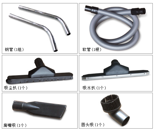 准配置信息: ·40mm吸尘扒1个 ·40mm吸水扒1个 ·40mm圆毛刷(1个) ·40mm尖吸嘴1个 ·40mm 2.5米软管1根 ·40mm吸尘钢管1组(2根) ·高效过滤器(2个) ·纸尘袋6个(选配)