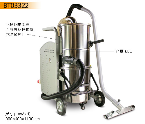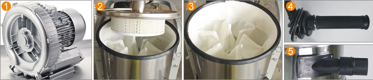 详细特点: 1.三相电,3KW 独立工业级涡轮增压真空泵,符合UL&CE等国际认证。可连续24小时工作,机器具有漏电,缺相、过热及过载保护装置; 2.可选配聚氨酯高效滤筒式过滤芯,过滤精度可达0.1μm。 3.标配聚酯纤维加附涂层星型袋式过滤器,过滤精度可达3μm以上,过滤效率为99.99%以上。 4.手动拍打震尘设计,迅速清除满身是灰尘的星型过滤网表面,保持最大真空吸力。 5.侧边尼龙吸尘口,形成旋风,吸力更强劲,整机采用高强度纯不锈钢制造,坚固耐用,桶壁光滑易清理,耐撞击。