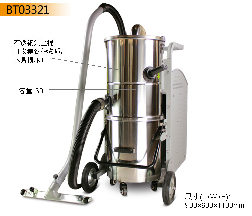 采用三相电,独立工业级涡轮增压真空泵,机器吸力强大,机身小巧,移动方便; 50毫米大口径吸尘配件,有效提高吸尘效率,可连续24小时工作;机器具有漏电,缺相、过热及过载保护装置; 标配星型过滤器过滤效果达到99.9%以上粉尘直径可达到3um,且在过滤桶内增加旋风结构,可保持持久的超高吸尘效率,是清理金属粉尘、塑料粉尘等细小粉尘的理想机型。