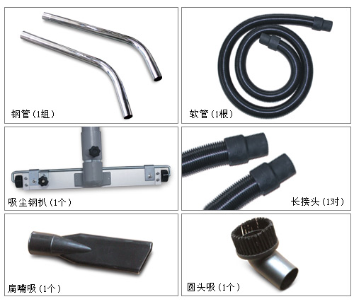 标准配置信息: ·50mm吸尘钢扒1个 ·50mm长扁咀1个 ·50mm圆毛刷1个 ·50mm长接头1对 ·5米50mm软管1根 ·50mm吸尘钢管1根